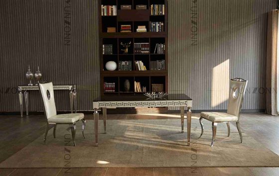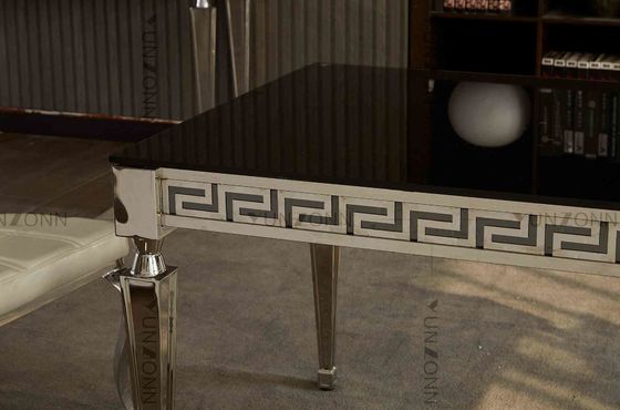 Kurze Schwarzglas-Tabelle mit geschnitztem Rand und den eckigen Beinen für Esszimmer