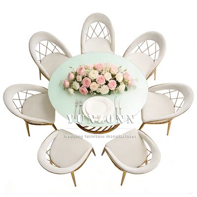 Q3: Welches Material verwenden Sie für Ihre Produkte? A3: Tisch und Stuhl Edelstahlrahmen, gehärtetes Glas auf dem Tisch; Marmor oder Holz. Die Stuhlkissen bestehen aus Schwämmen hoher Dichte und hochwertigem Leder oder Stoff.