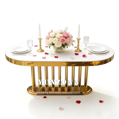 | Produktname: | Großhandel für Hochzeitsmöbel, goldener ovaler Edelstahlrahmen, weiße Spiegelglasplatte, langer Esstisch für Hotels und Hochzeiten |